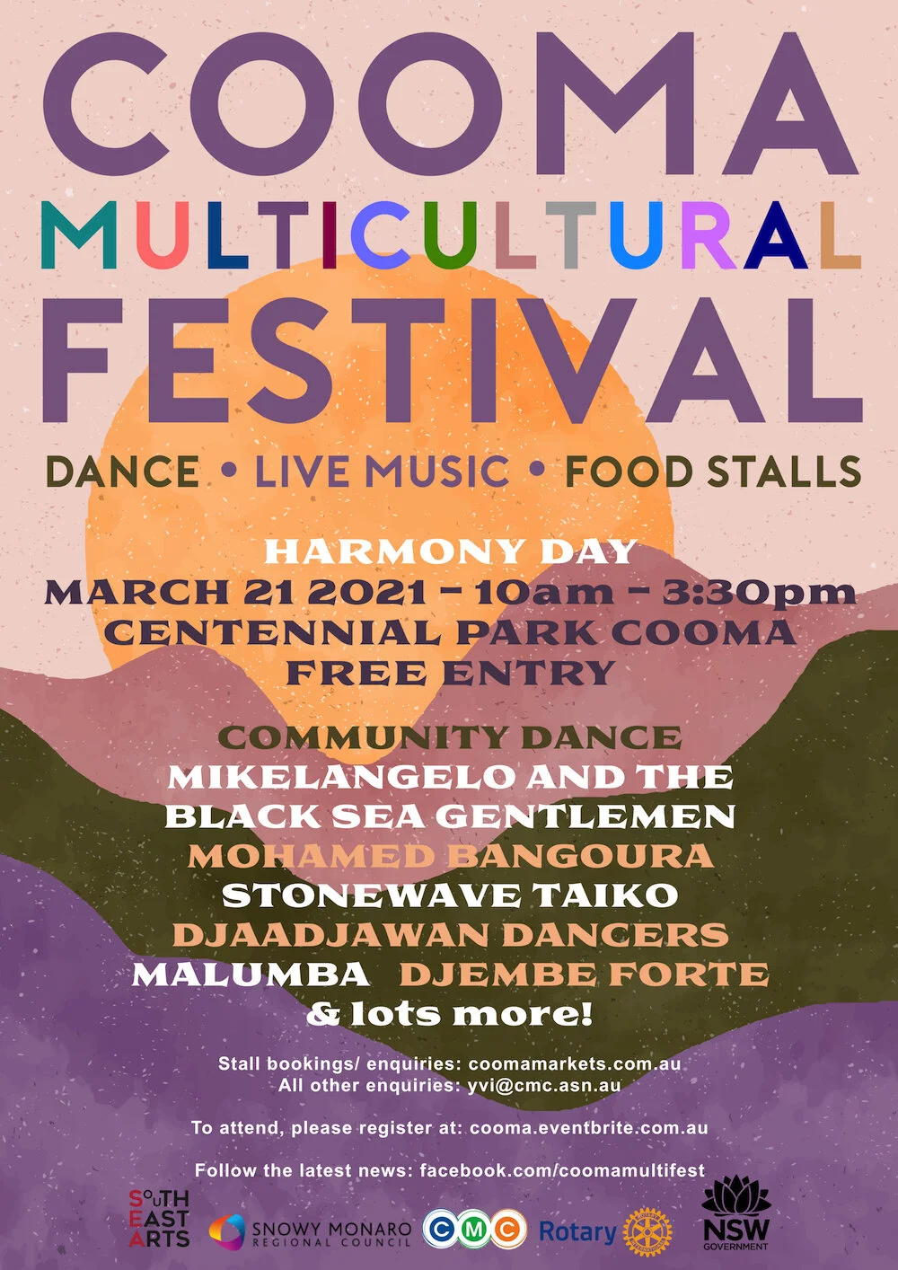 South East Arts alongside Cooma Multicultural Community Festival, Snowy Monaro Regional Council, Cooma Rotary Club Inc. and Create NSW are pleased to present the Cooma Multicultural Festival at Centennial Park in Cooma on MARCH 21 as part of Harmony Day 2021.